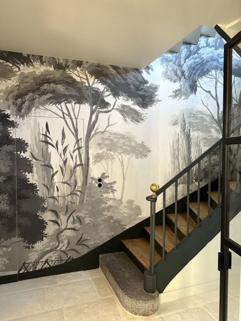 Dans la montée de l’escalier, le papier peint panoramique s’impose comme une respiration visuelle : un décor enveloppant qui guide le regard, crée de la profondeur et intègre discrètement la porte menant à la suite parentale.