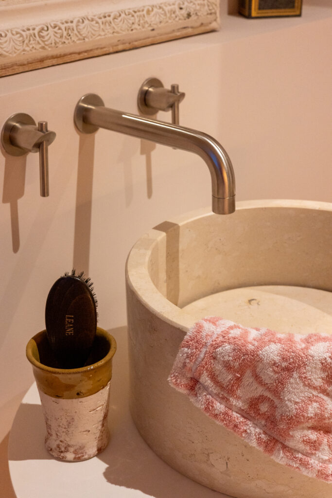 Les teintes poudrées et naturelles dialoguent avec les textures pour créer une atmosphère apaisante, un lieu intime et authentique.