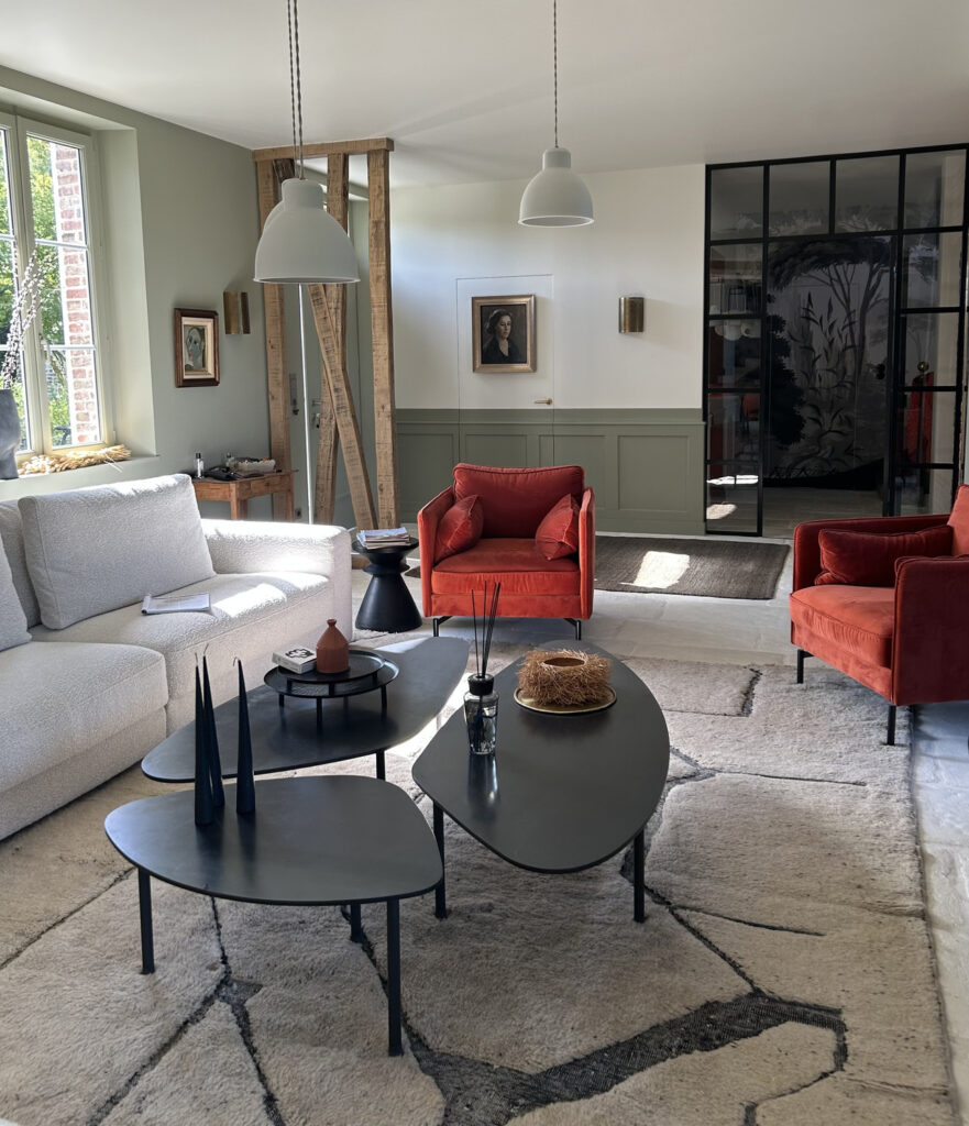 Grâce à ce travail colorimétrique précis et réfléchi, cette grande maison normande trouve progressivement son atmosphère : douce, lumineuse et équilibrée, où chaque espace se distingue tout en restant parfaitement relié aux autres.