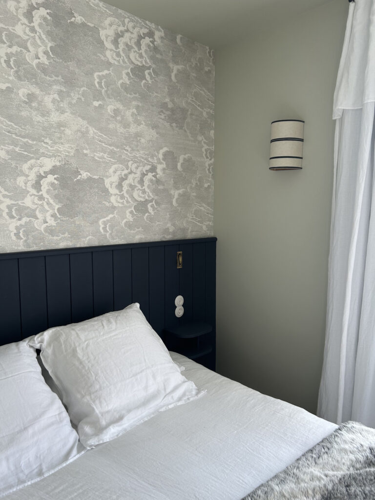 Le choix des papiers peints a été réfléchi comme un prolongement de la couleur et des matériaux existants. Chaque motif apporte profondeur, rythme et caractère, tout en faisant écho aux matières nobles de la maison, comme la pierre et le silex. Ce travail combiné sur les couleurs et les papiers peints permet de souligner les volumes, valoriser les textures naturelles.